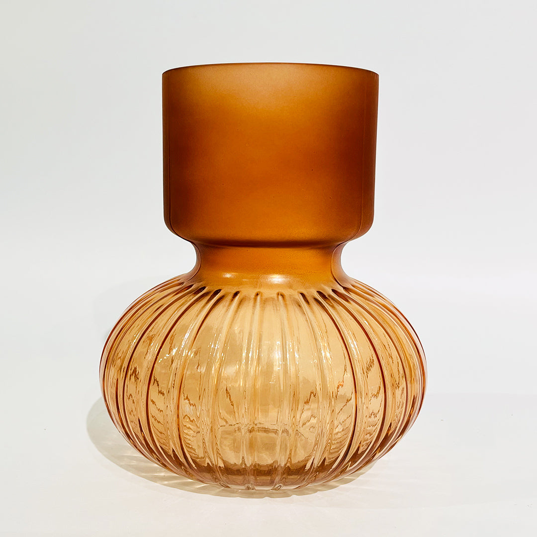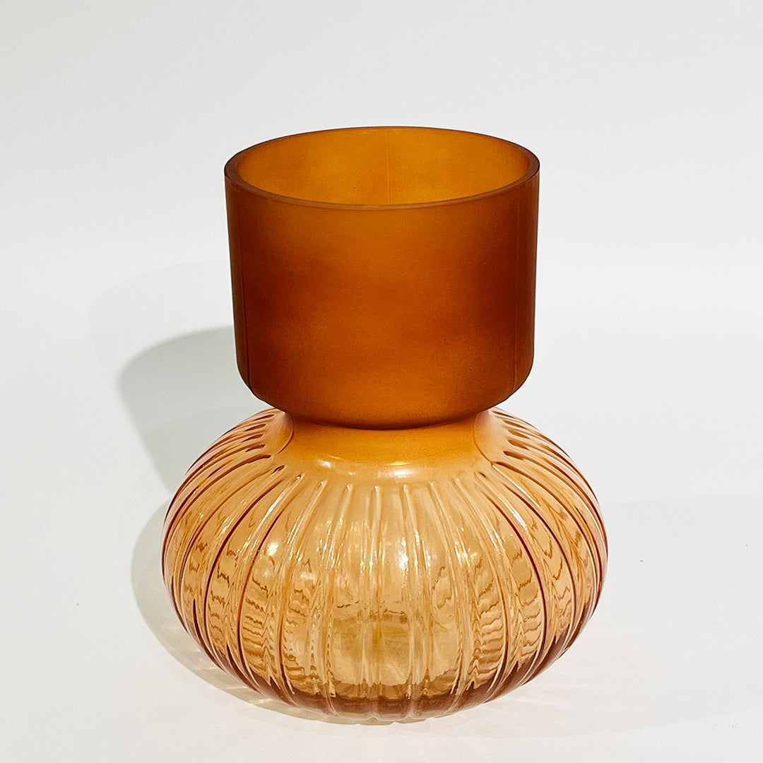 Aporta calidez y estilo a tus espacios con este elegante florero decorativo en vidrio color ámbar. Su diseño combina una base acanalada transparente con una parte superior de acabado mate, creando un contraste moderno y sofisticado.