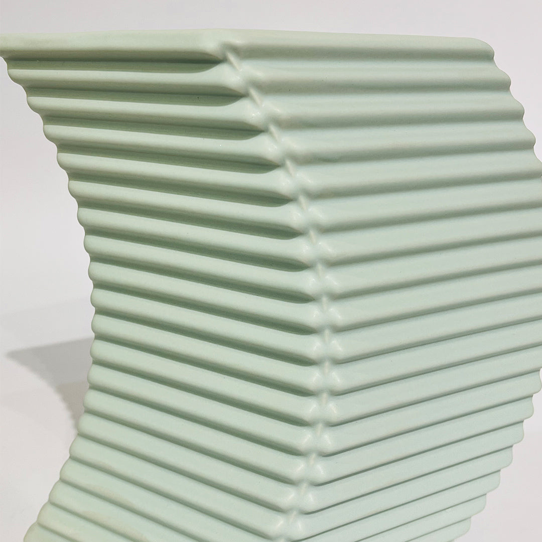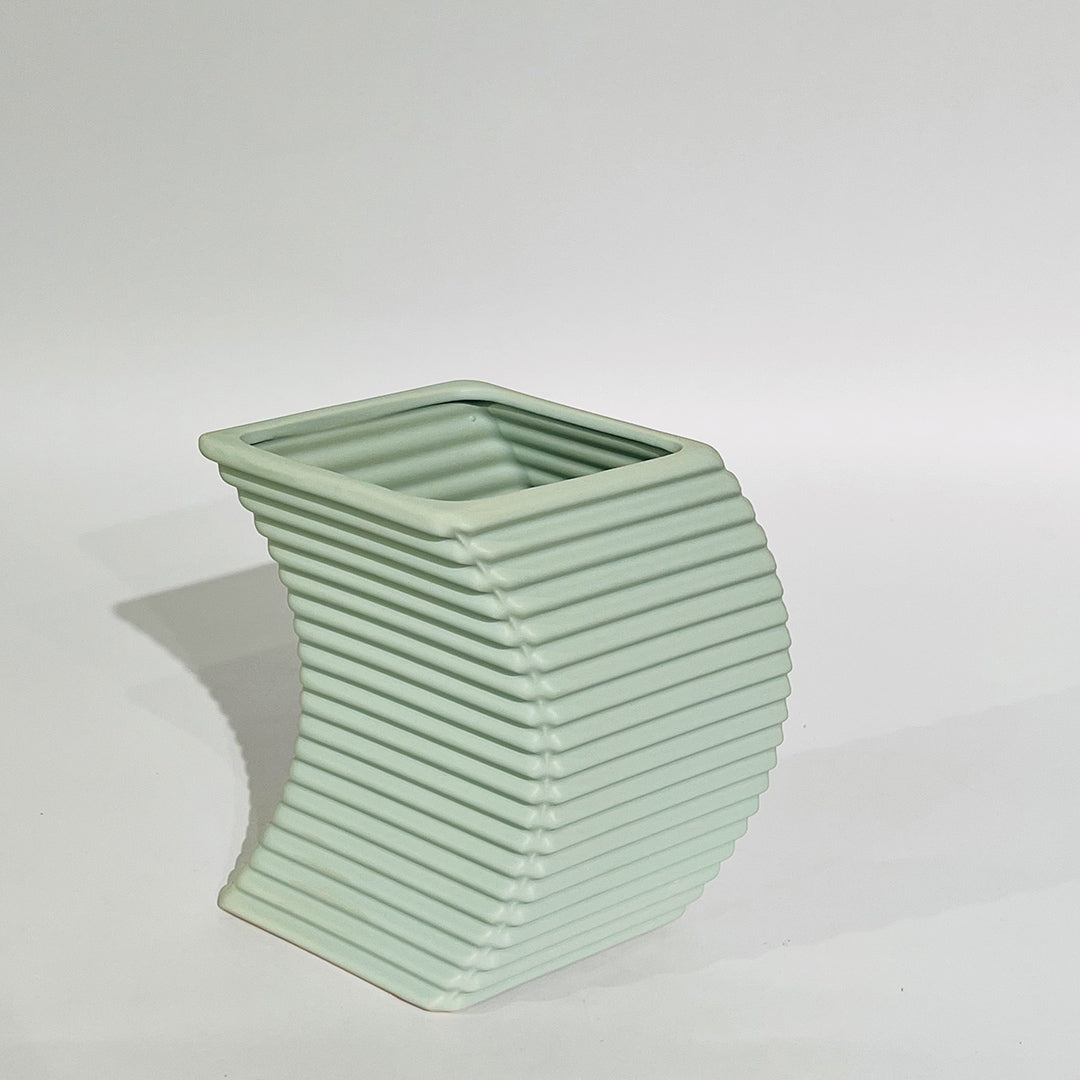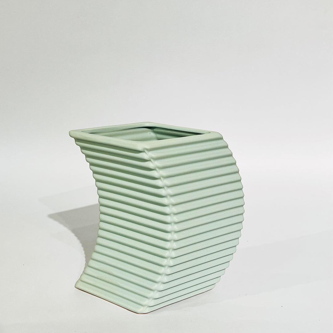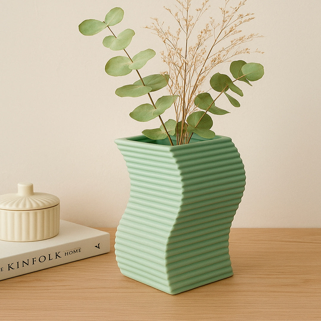 Aporta un toque moderno y original a tu decoración con este florero decorativo en vidrio color verde suave. Su diseño curvado con textura acanalada crea un efecto visual œnico, ideal para dar personalidad a cualquier ambiente.