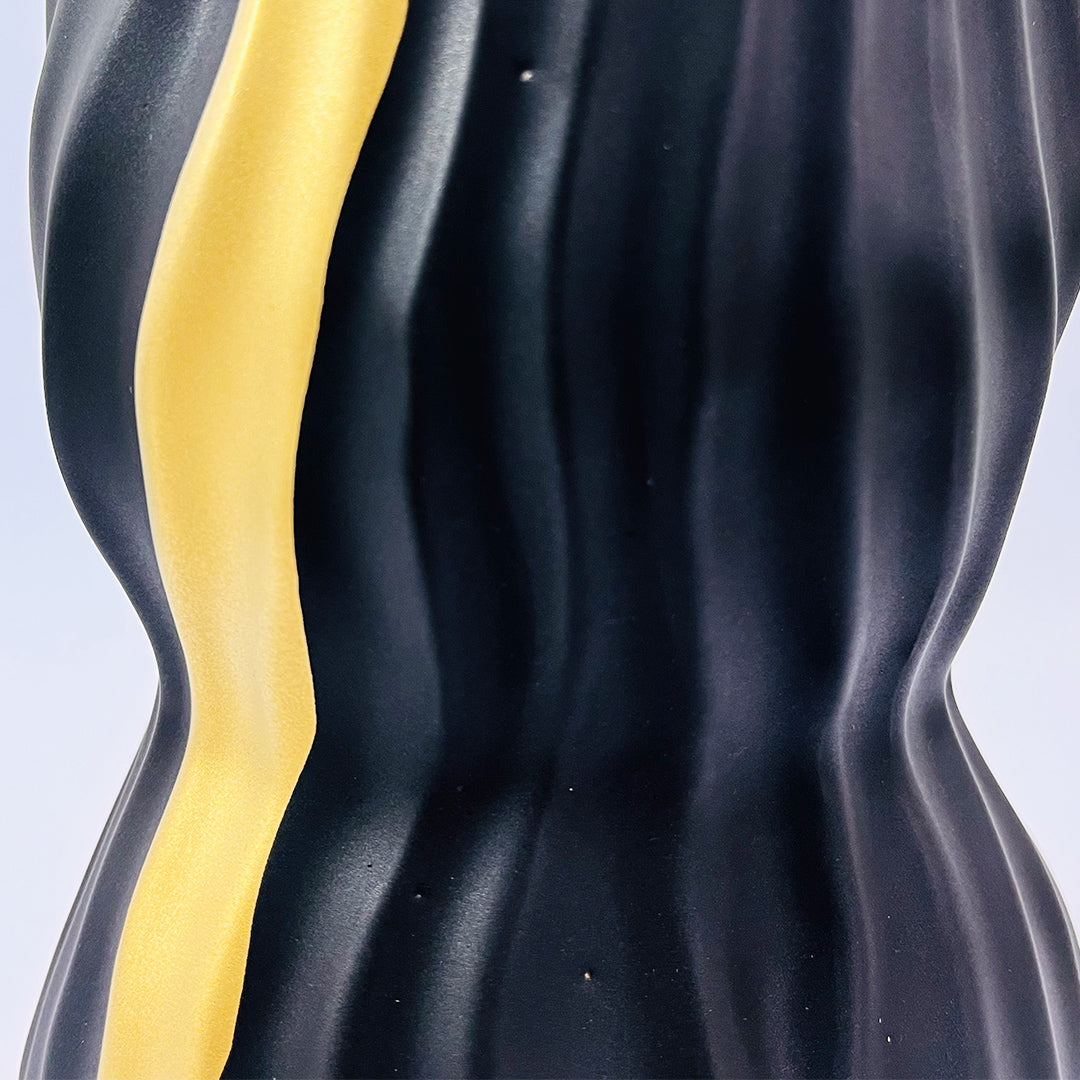 Jarrón elegante elaborado en cerámica con acabado negro y finos detalles dorados que aportan un toque de lujo y distinción. Perfecto para realzar la decoración de salas, comedores o espacios modernos.