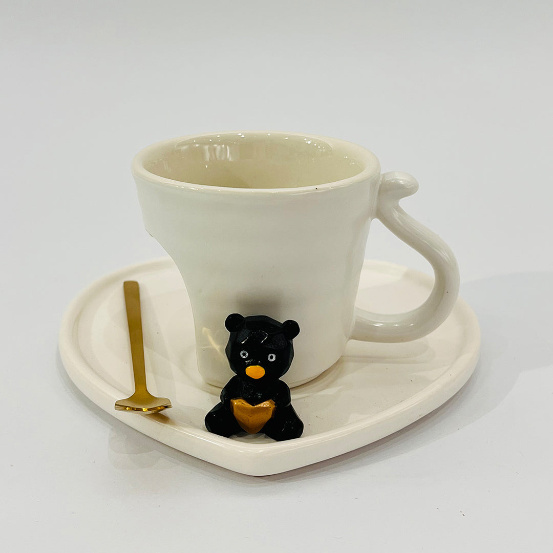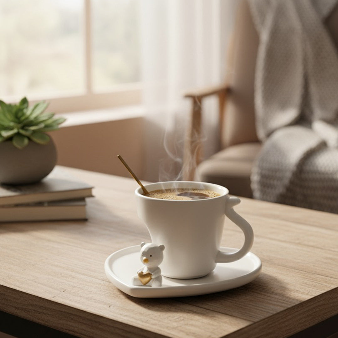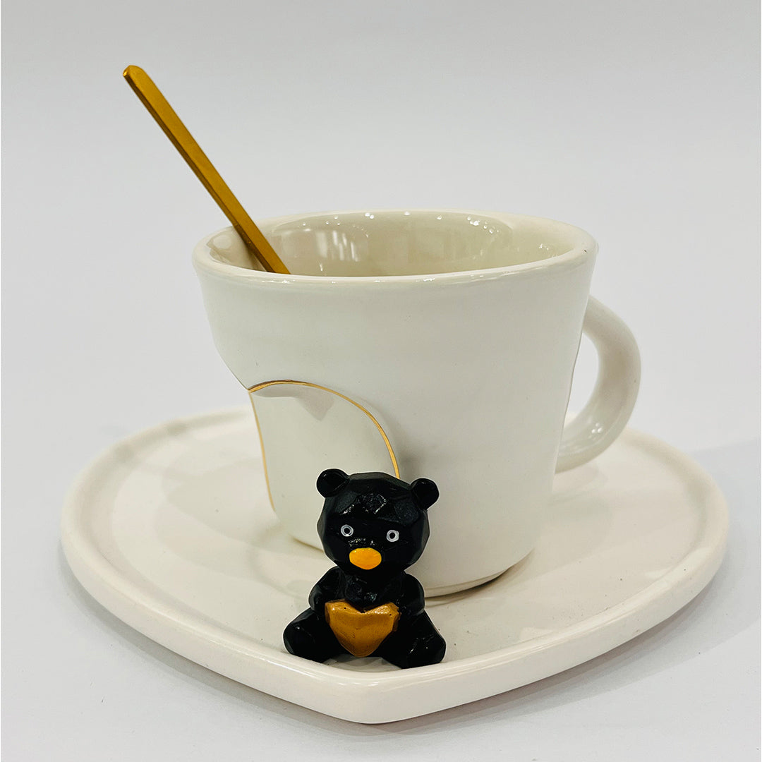 Taza decorativa con plato color blanco en forma de corazón y cucharita dorada, acompañada de un adorable osito negro con corazón dorado. Ideal para disfrutar tu café con estilo y un toque tierno.